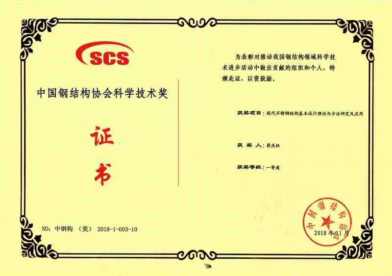 會(huì)議上還進(jìn)行了“2018年度中國(guó)鋼結(jié)構(gòu)年度獎(jiǎng)”的頒獎(jiǎng)典禮。東閣不銹鋼公司與東南大學(xué)、清華大學(xué)等單位聯(lián)合申報(bào)的“現(xiàn)代不銹鋼結(jié)構(gòu)基本設(shè)計(jì)理論與方法研究及應(yīng)用”獲得“中國(guó)鋼結(jié)構(gòu)協(xié)會(huì)科學(xué)技術(shù)一等獎(jiǎng)”。